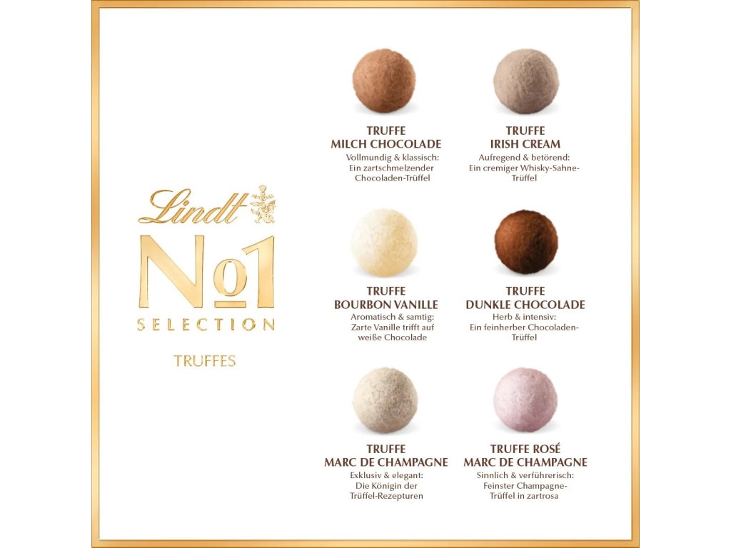 Vítejte ve světě, kde je absolutní kvalita na prvním místě. Lindt No1 Selection kombinuje vynikající suroviny s těmi nejlepšími recepty. Lindt & Sprüngli poprvé spojuje nejoblíbenější výtvory z různých produktových řad v jedinečné kolekci. Ať už jako exkluzivní dárek nebo pro vaše vlastní potěšení, vysoce kvalitní pralinky, vynikající lanýže, ručně vyráběné tyčinky a mnoho dalších prémiových receptur nabízí dokonalý čokoládový zážitek. Elegantní balení ztělesňuje prémiovou kvalitu a slouží jako stylová dekorace: decentní elegance, sofistikovaný design, vynikající řemeslné zpracování a pečlivá pozornost k detailu. Výběr lanýžů v No1 Selection No1 nabízí bohaté a klasické, vzrušující a svůdné nebo odvážné a intenzivní výtvory od mistrů čokolády Lindt. Celkem šest různých vynikajících lanýžů vytváří bezkonkurenční chuťové zážitky. Obsah: 2x Lanýžová mléčná čokoláda 2x Lanýžová Bourbon Vanilla 2x Lanýžová Irish Cream 2x Lanýžová hořká čokoláda 2x Truffe Marc de Champagne 2x Truffe Rosé Marc de Champagne