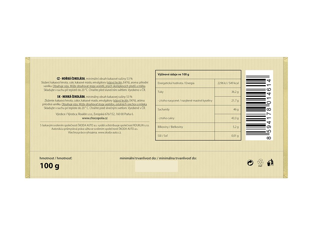 Čokolády jsou vyráběběny v gramážích od 100 g až do 1 kg.