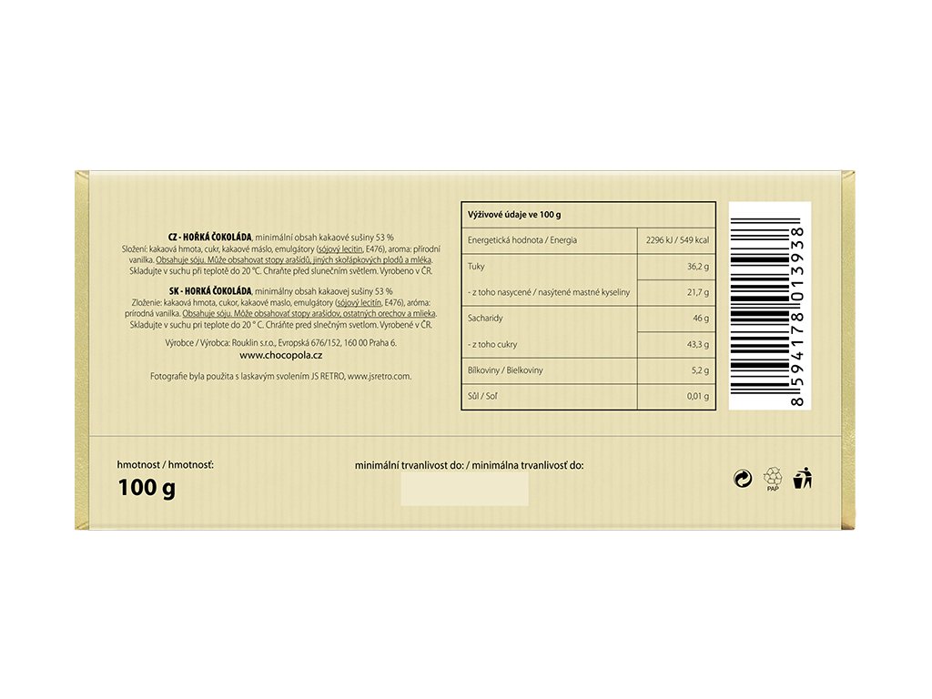 HOŘKÁ ČOKOLÁDA, minimální obsah kakaové sušiny 53 %.