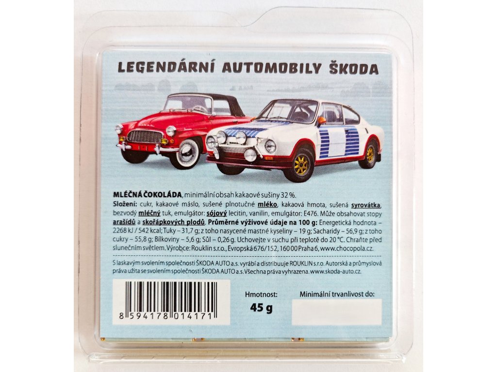 Mix devíti motivů lahodných mléčných mini čokolád pro milovníky legendárních vozidel značky Škoda od českého výrobce Chocopola. Baleno v průhledném blistru.