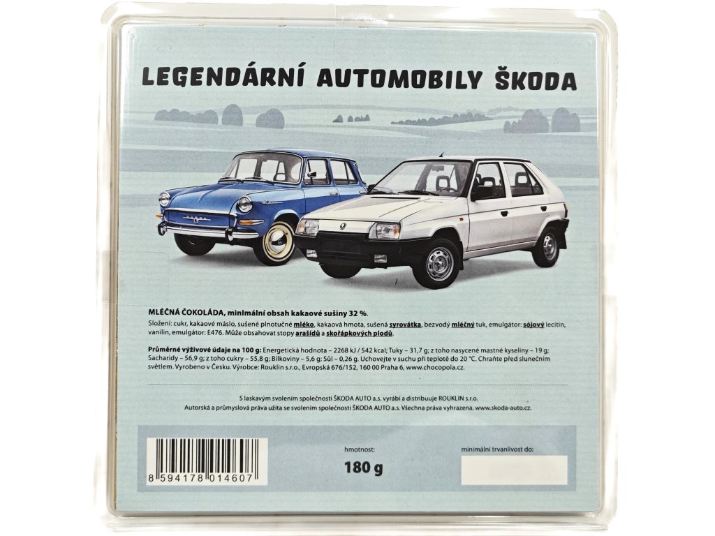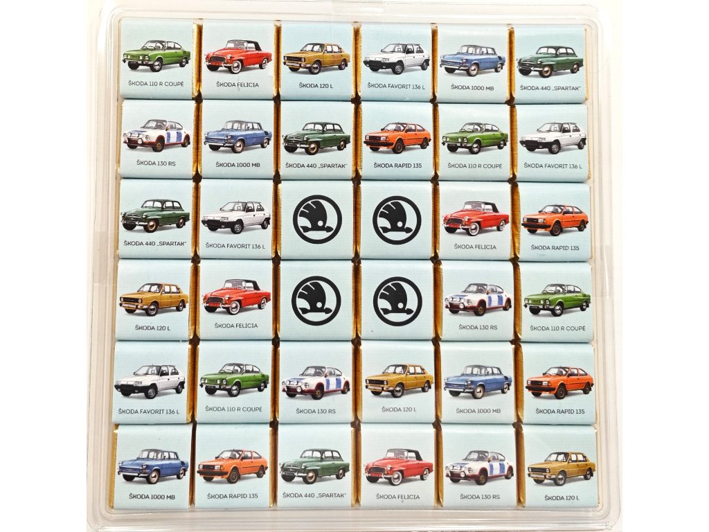 Mix 36 motivů lahodných mléčných mini čokolád pro milovníky legendárních vozidel značky Škoda od českého výrobce Chocopola. Baleno v průhledném blistru.