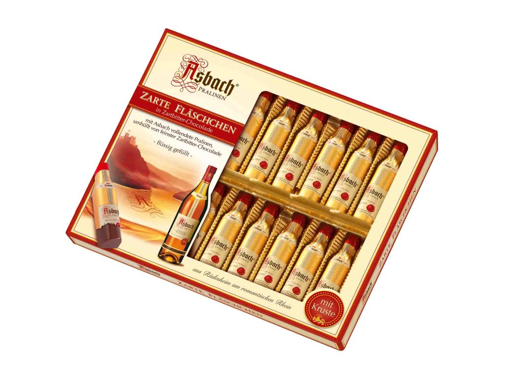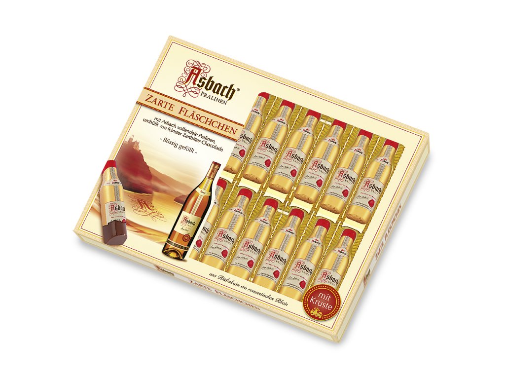 Lahvičky plněné známou jemnou brandy Asbach (20 kusů), uvnitř cukrové krusty a jemné hořko-sladké čokolády a mléčné čokolády s brandy.