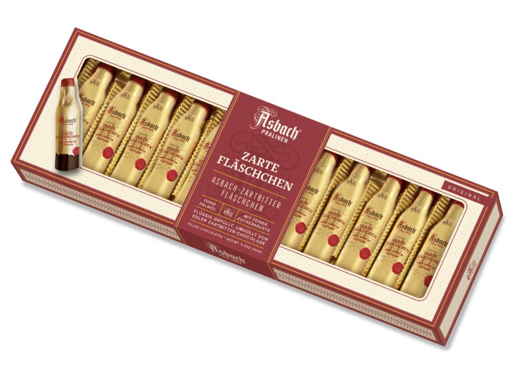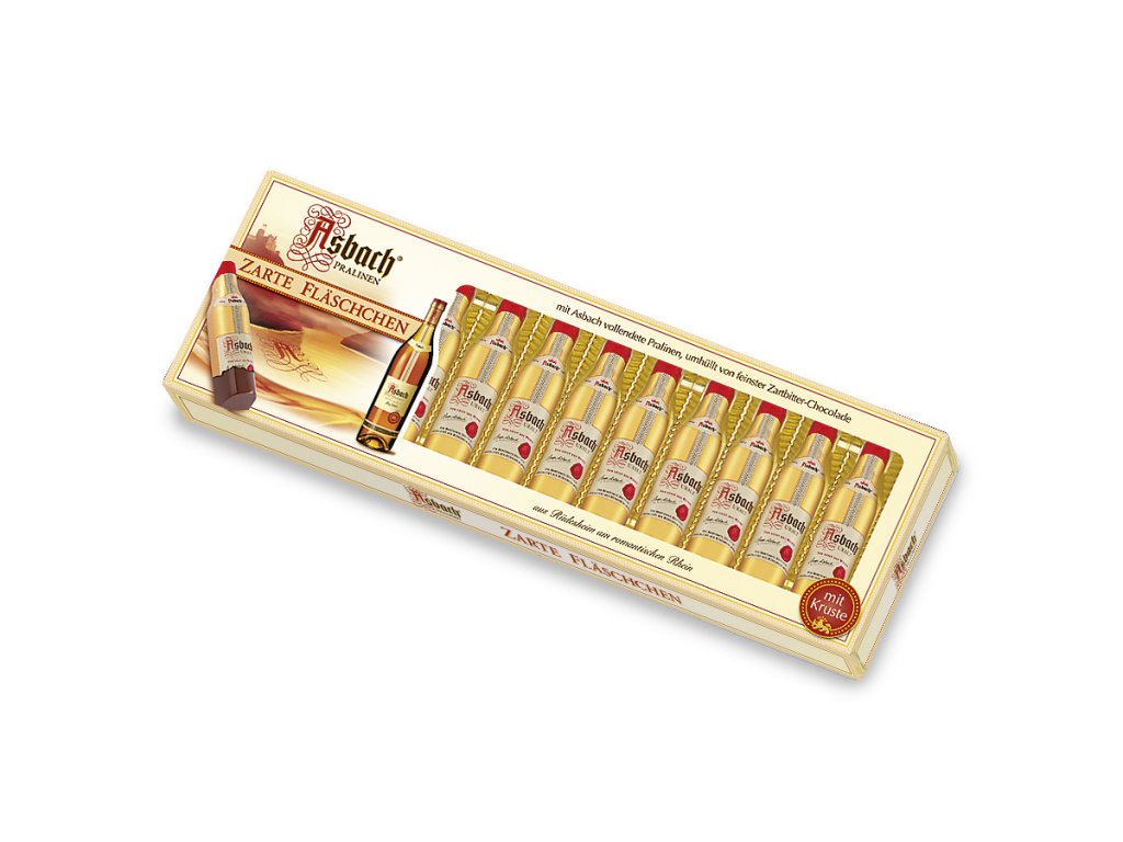 Lahvičky plněné světoznámou jemnou brandy Asbach (12 kusů), uvnitř cukrové krusty a jemné hořko-sladké čokolády.