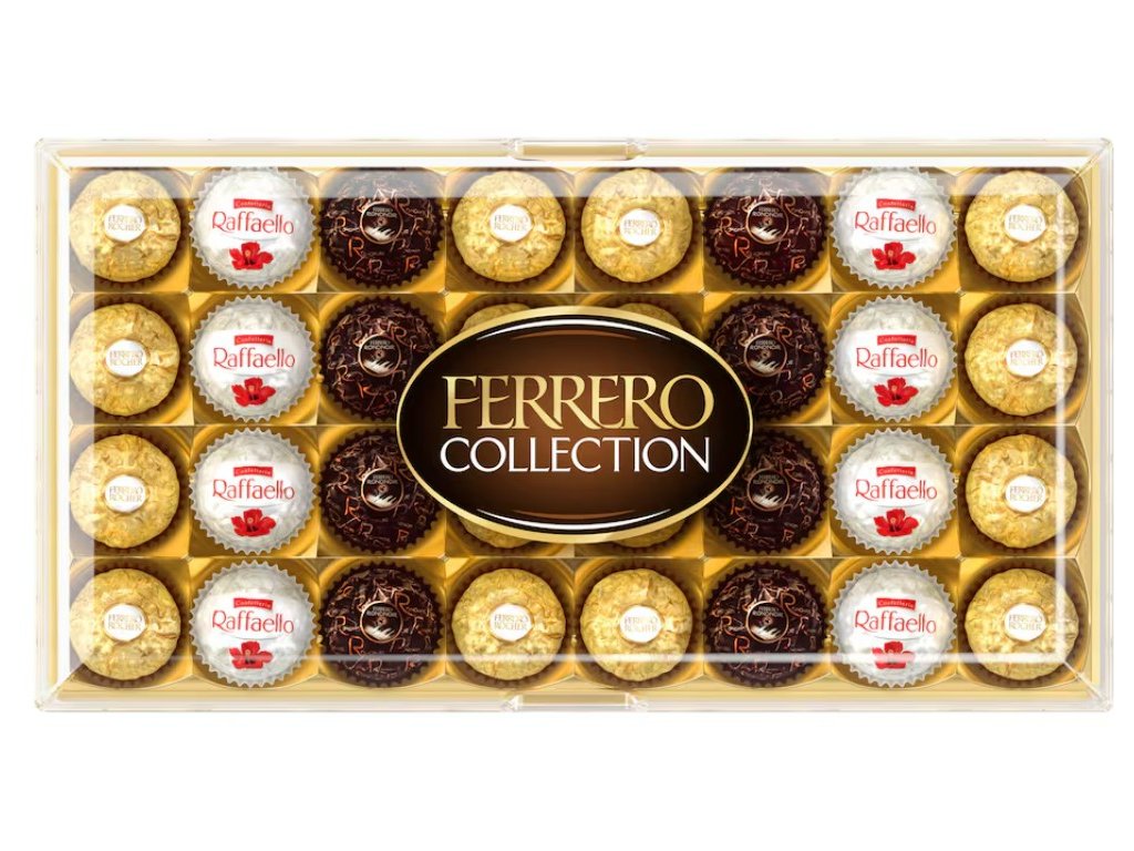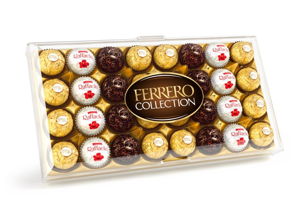 Kolekce tří druhů pralinek Ferrero v dárkové krabici: Ferrero Rocher, Ferrero Rondnoir a Raffaello.