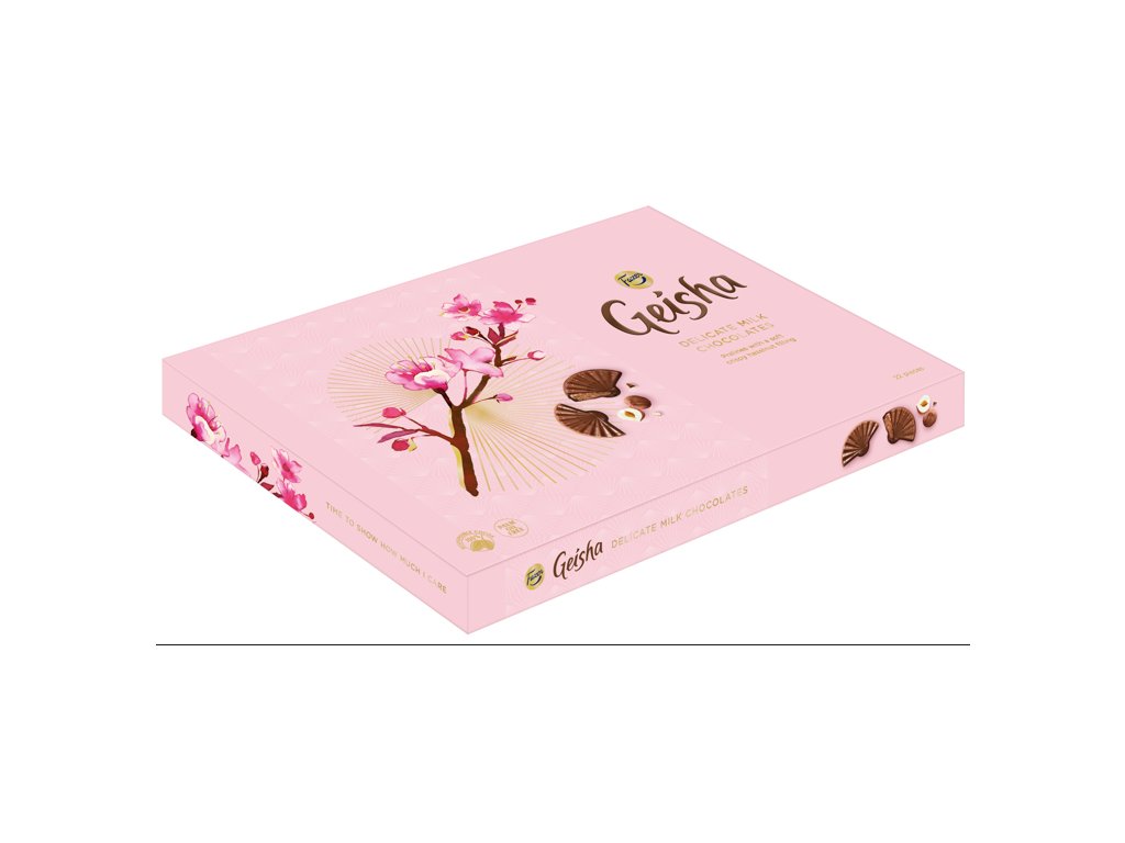 Mléčné čokoládové bonbóny s náplní z lískových oříšků a nugátu (38%).