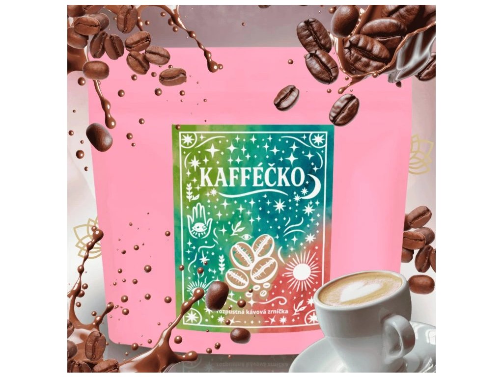 Příprava: 2 až 4 kávová zrníčka zalijte horkou vodou, zamíchejte lžičkou a nápoj Kaféčko je na světě.