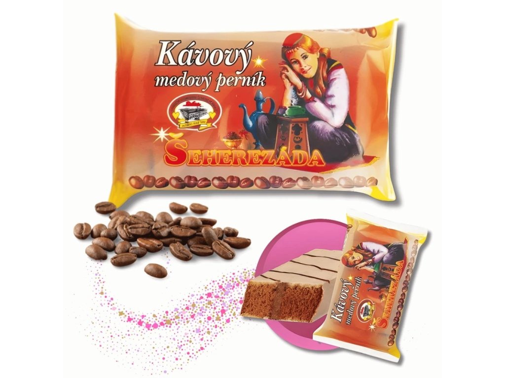Cukrářská poleva světlá 28% (cukr, plně ztužený rostlinný tuk palmojádrový, sušená syrovátka, sušené mléko odstředěné, emulgátor sójový lecitin, aroma), kávová šlehaná náplň (27%) [cukr, cukrářská poleva tmavá (cukr, plně ztužený rostlinný tuk palmojádrový a palmový v různém poměru, kakaový prášek se sníženým obsahem tuku 16%, emulgátor sojový lecitin, aroma), plně ztužené palmové rostlinné tuky, džem ovocný meruňkový (ovocné dřeně meruňková 15%, jablečná a višňová, cukr, glukózový sirup, želírující látka pektin, kyselina citronová, aroma), sojová mouka, káva pražená, rumové aroma], pšeničná mouka, cukr, med 5 %, voda, vejce, kypřící látky hydrogenuhličitan sodný a hydrogenuhličitan amonný, perníkové koření.