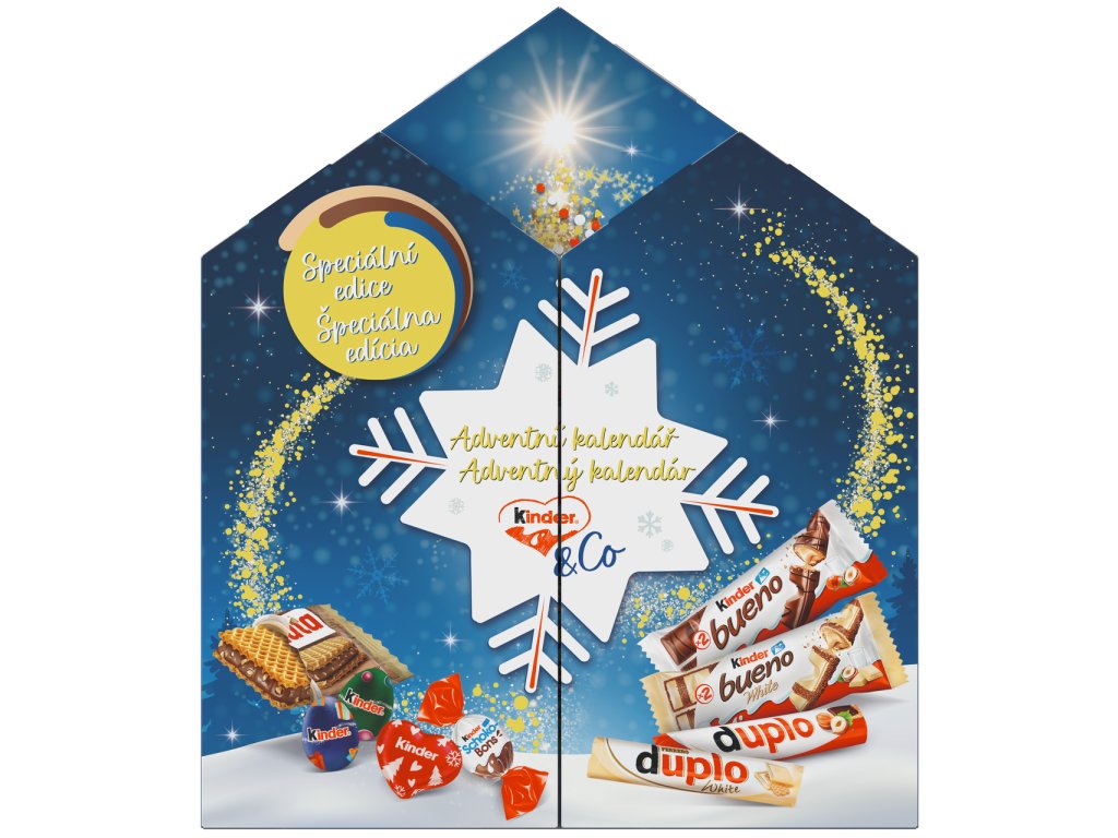 1 × Kinder Bueno , 1 × Kinder Bueno White, 4 × Kinder Schoko-Bons, 1 × Duplo, 2 × Duplo White, 2 × Hanuta, 4 × Kinder Mini Eggs Hazelnut - 4 × Kinder Mini Eggs Milk - 5 × Kinder Love.