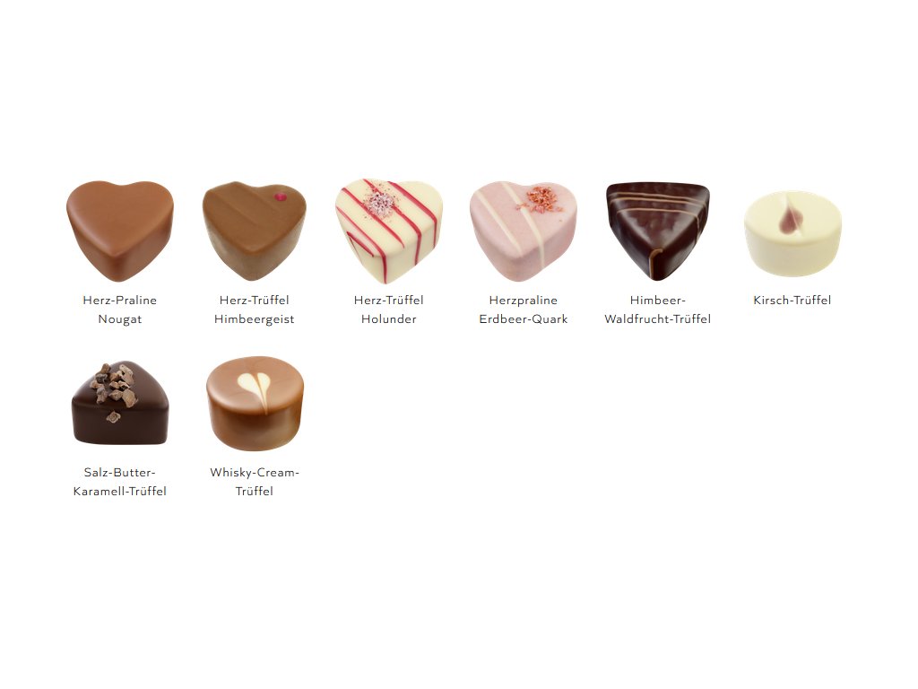 Cukr, kakaové máslo, kakaová hmota, sušené plnotučné mléko, šlehačka, lískové ořechy, sušené odstředěné mléko, glukózový sirup, zvlhčovadlo: sorbitolový sirup; bezvodý mléčný tuk, máslo, šumivé víno, bezinkový destilát, malinový destilát, voda, maltodextrin, jahodový likér, emulgátory: sójový lecitin, slunečnicový lecitin; Whisky smetanový likér, aroma, nízkotučný tvarohový prášek, koncentrát třešňové šťávy, whisky, malinový prášek, regulátor kyselosti: kyselina citronová; kakaové kousky, koncentrát šťávy z višní, jahody, sirup z bezových květů (cukr, voda, květy bezu), koncentrát jahodové šťávy, sůl, višně, přírodní aroma, vanilkový extrakt, bourbonská vanilka, barvivo: šťáva z červené řepy; barvivo ovocný koncentrát (bezinky), koření, barvivo: pravý karmín; fruktóza, modifikovaný škrob, prášek z černého rybízu, zahušťovadlo: alginát sodný.