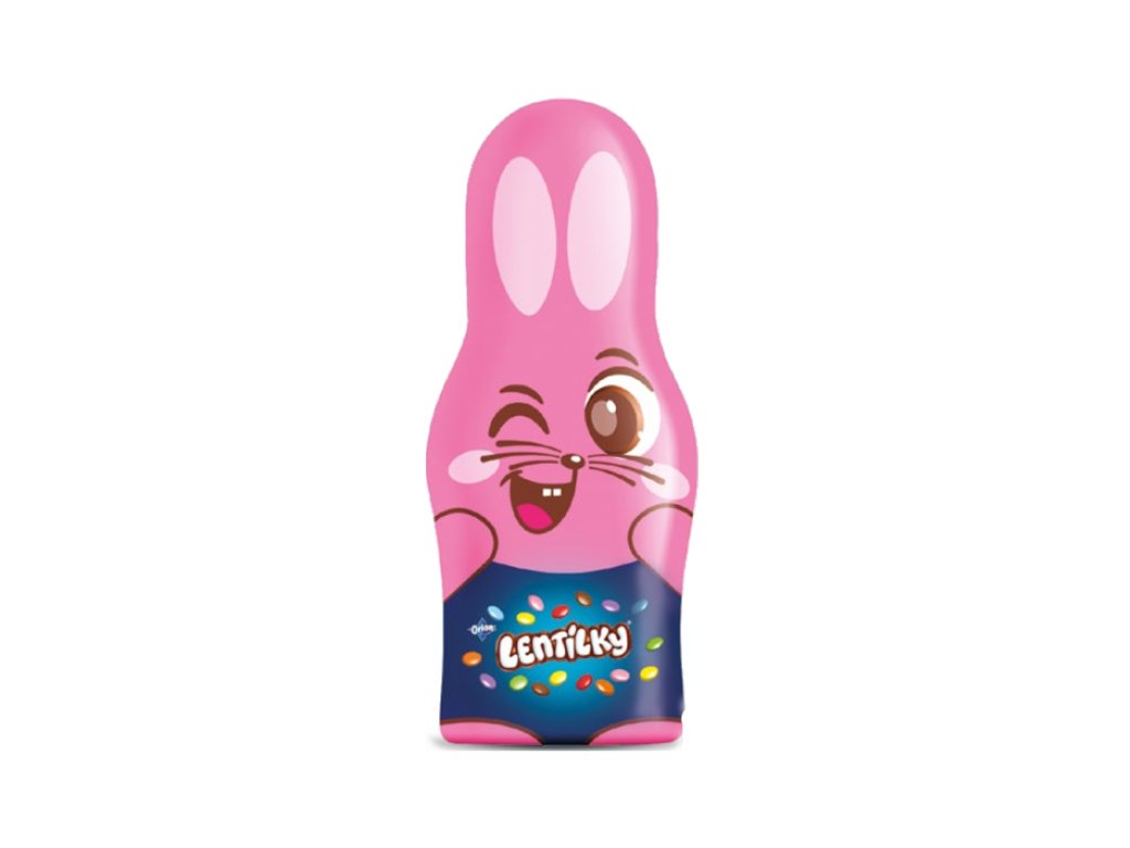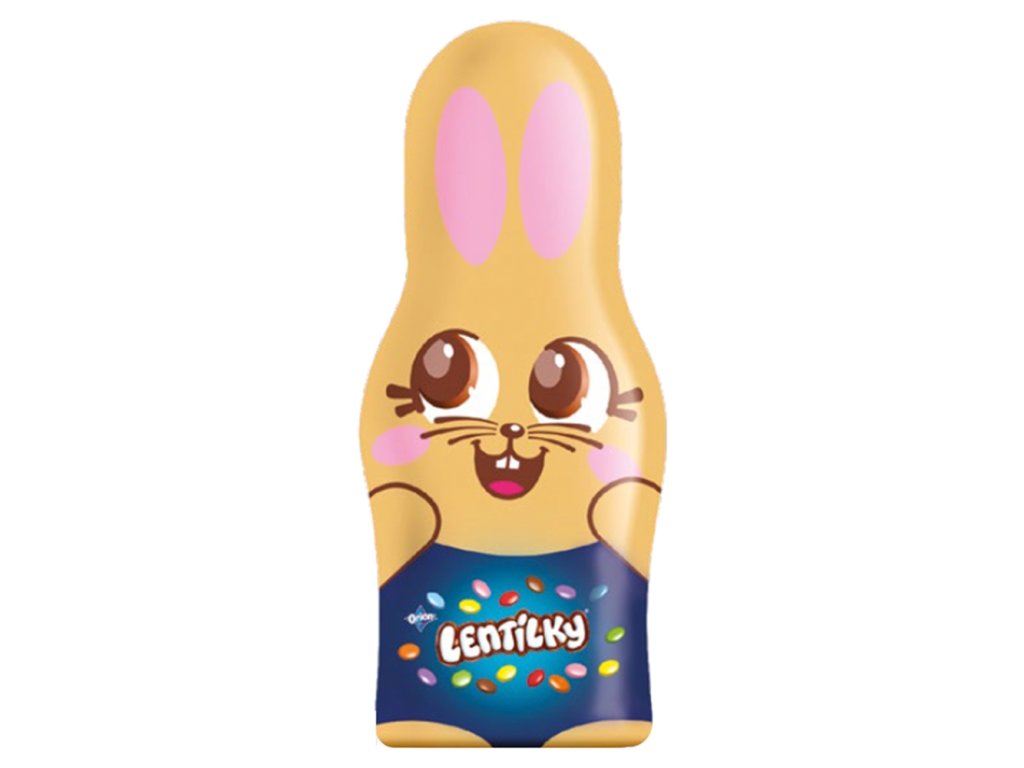 Dutá figurka z mléčné čokolády 91 % s mléčnou čokoládou dražovanou v cukerné krustě uvnitř 9 %.