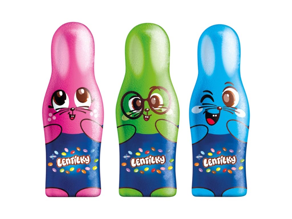 Dutá figurka z mléčné čokolády 88 % s mléčnou čokoládou dražovanou v cukerné krustě uvnitř 12 %.