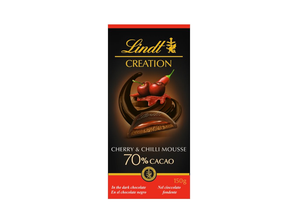 Čokoláda Lindt Creation Cherry & Chilli má díky svému vysokému podílu kakaa chuť lahodné hořké čokolády, která je podtržená kombinací nakyslé višně a žhavého chili.