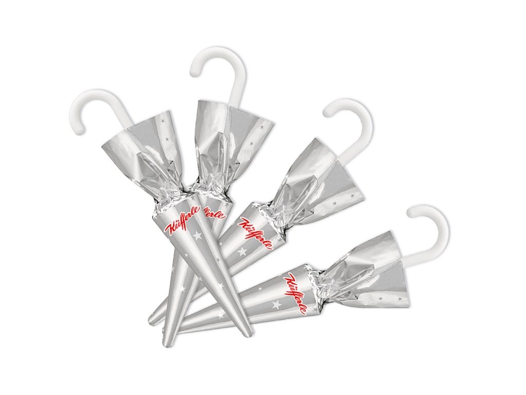 Mléčná čokoláda s jemně mletými oříšky (lískooříšková pasta - LINDT) na tyčince ve tvaru deštníku.