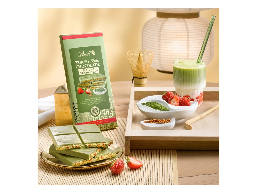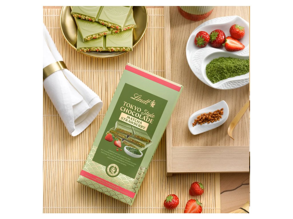 Cukr, kakaové máslo *, sušené plnotučné mléko , mandle (8 %), sušené odstředěné mléko , přepuštěné máslo , sušený kokos, prášek ze zeleného čaje matcha* (2 %), smetanový prášek, pšeničná mouka , pražená rýže (0,5 %), jahody* (0,4 %), emulgátor ( sójový lecitin ), přírodní aromata, kukuřičný škrob, sůl, aromata, slunečnicový olej, maltodextrin, modifikovaný škrob, zahušťovadlo (pektin), lískové ořechy . *Matcha, kakaové máslo z mimo EU , jahody z EU a mimo EU.