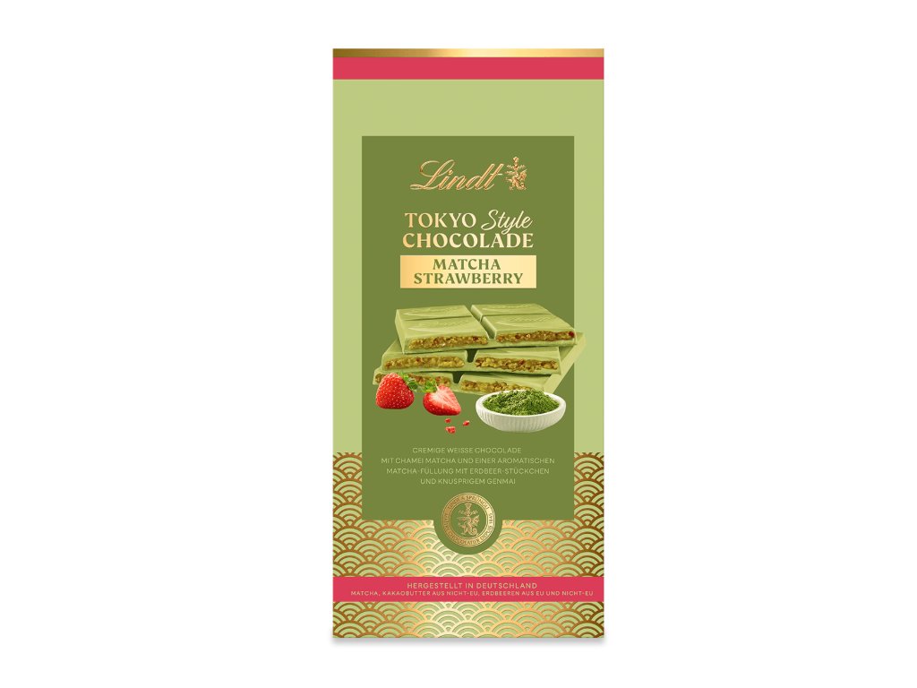 Bílá čokoláda s práškem ze zeleného čaje matcha (2 %), plněná mandlovým, jahodovým a matchovým krémem (23 %) s praženou rýží Genmai.