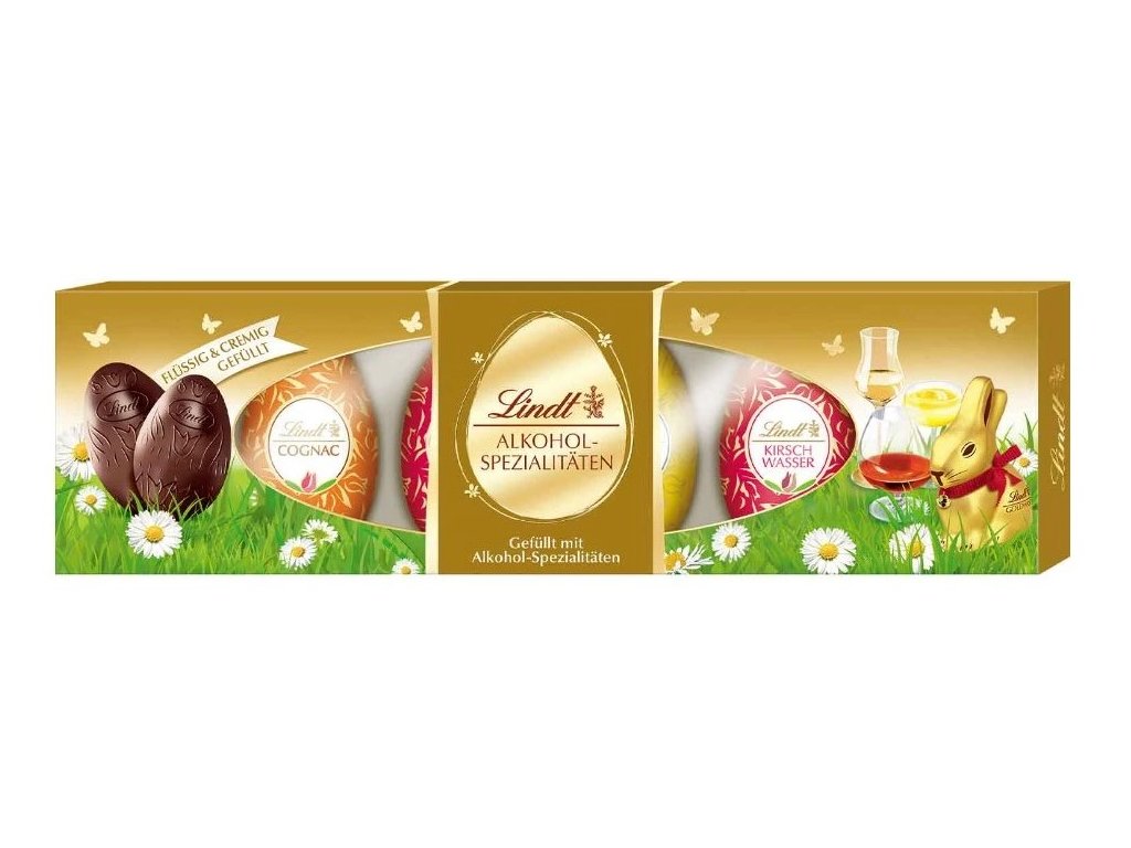 Udělejte na Velikonoce někomu velkou radost s Lindt Alcohol Specialty Eggs. Ochutnejte náplně ze smetanového vaječného koňaku, aromatického koňaku nebo ovocného TŘEŠNOVÉHO likéru, které se spolu se skořápkou křupavé tmavé čokolády lahodně spojí v ústech. Cca 4,5 cm velká alkoholová speciální vejce jsou ideální jako dárky pro dospělé se sladkým chutí.