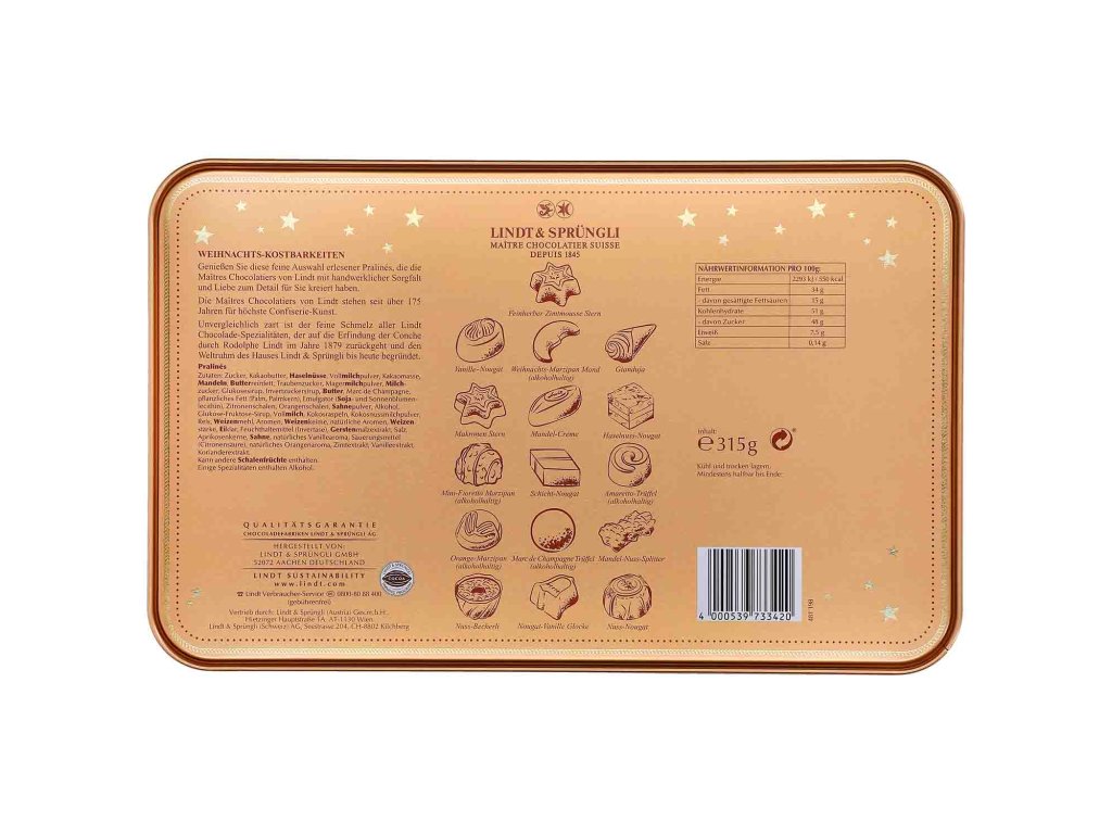 Vychutnejte si tento skvělý výběr vynikajících pralinek, které pro vás vytvořili mistři čokolády Lindt s řemeslným zpracováním a smyslem pro detail. Různé výtvory jsou prezentovány v nostalgické kovové plechovce, kterou lze báječně sdílet s ostatními nebo sníst sami. Ideální také jako dárek.