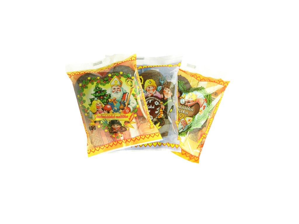 Medový perník s malinovou džemovou náplní a tmavou nebo světlou cukrářskou polevou, obal s mikulášským motivem
