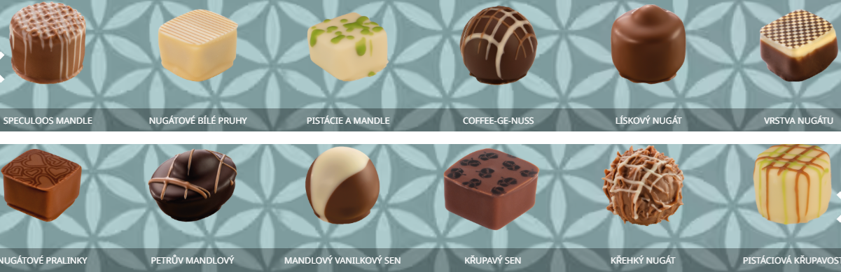 Cukr, kakaové máslo, lískové ořechy 14 %, sušené plnotučné mléko, kakaová hmota, mandle, pistácie, pšeničná mouka, emulgátor: lecitiny (slunečnicový, sójový); smetanový prášek, kokosový tuk, káva, přírodní vanilkové aroma, koření: skořice, koriandr, anýz, hřebíček, muškátový oříšek; sušené odstředěné mléko, lusk Bourbon vanilky, koncentrované máslo, karamelový sirup, kakaový prášek, glukózový sirup, barviva (extrakt ze světlice barvířské, extrakt ze spiruliny), sůl, slunečnicový olej, maltodextrin.