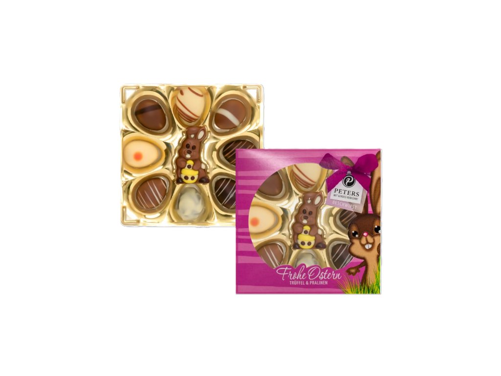 Čokoládový zajíček s ručně vyrobenými mini lanýžovými vejci v osmi příchutích.
