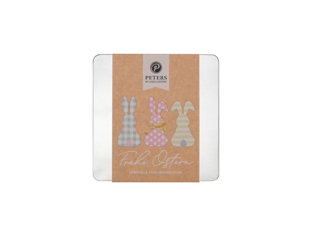 Naše klasická kovová krabička ve velikonočním hávu s motivem "Králičí trio" - jako vždy s těmi nejlepšími lanýži z naší firmy.