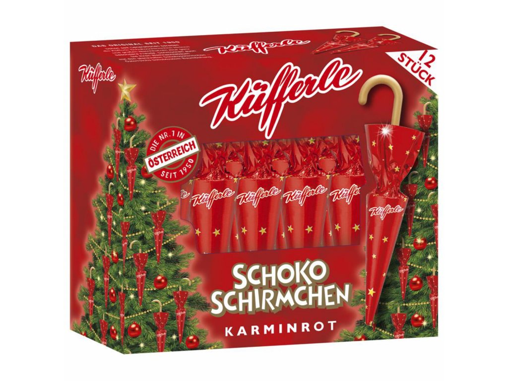 Čokoládové deštníky od Küfferle se skvěle hodí k zavěšení na sladký vánoční stromek. Mléčná čokoláda v kombinaci s mletými lískovými oříšky svádí k ochutnání jak malé, tak velké.