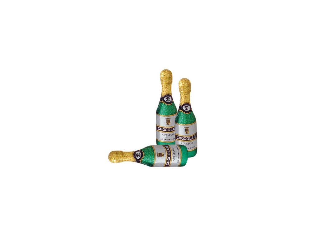 Dutá figurka ve tvaru lahve, 8 g, zabalená ve fólii, vyrobená z mléčné čokolády s 30% obsahem kakaa tradičním způsobem z kakaových bobů.