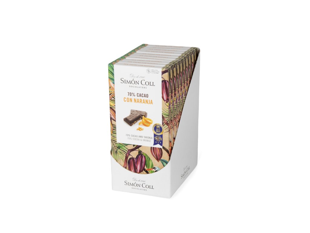 Čokoláda se 70% kakaem a dehydrovanými přírodními pomerančovými kousky. Vyrobeno z vysoce kvalitních surovin a tradičním způsobem pražení kakaových bobů v továrně Simón Coll. Citronové a ovocné pomerančové tóny se dokonale snoubí s intenzitou hořké čokolády a vytvářejí tak dokonalou kombinaci.