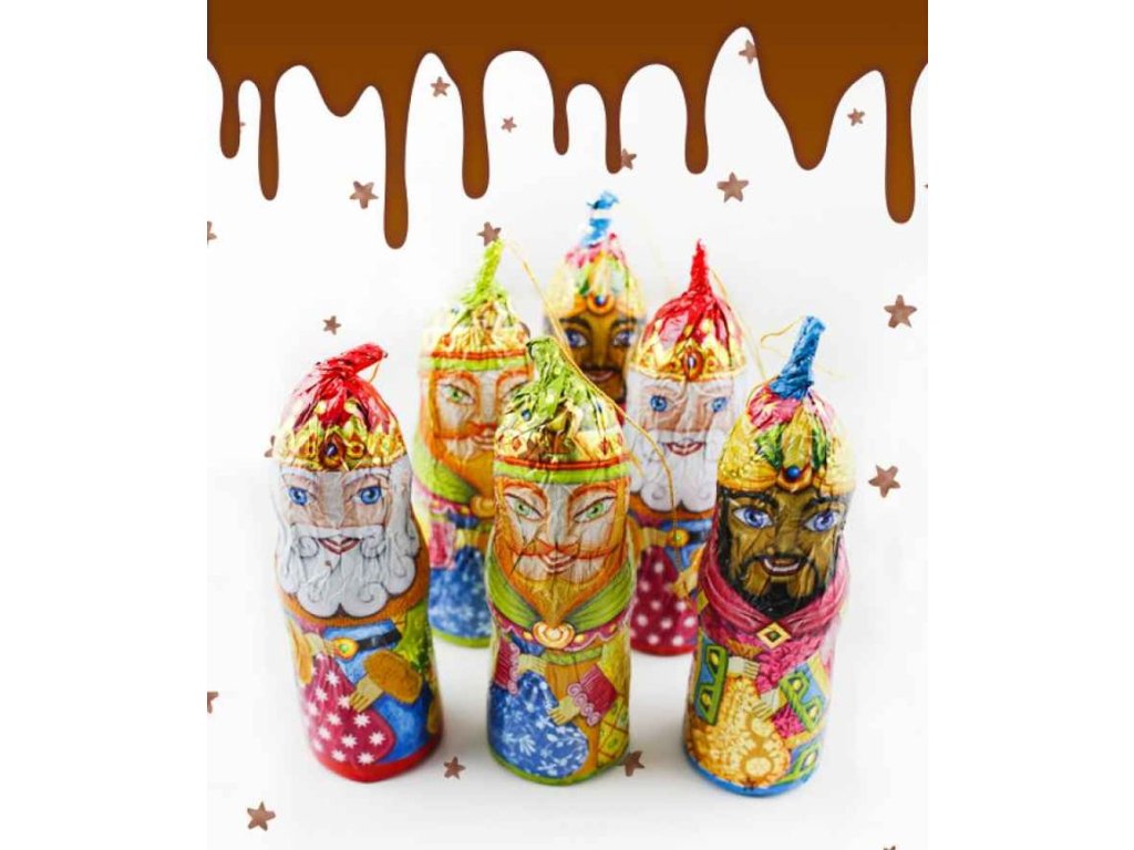 Duté figurky z mléčné čokolády (30 % kakaa) s hliníkovým alobalem s motivy tří králů. Každá figurka má připevněnou šňůrku, takže je ideální k zavěšení na vánoční stromeček nebo k ozdobení jakéhokoli místa v domácnosti během svátečního období.