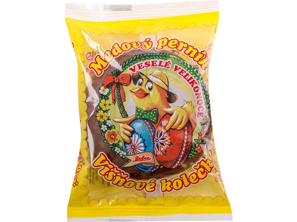 Medový perník s džemovou višňovou náplní s tmavou cukrářskou polevou, obal s velikonočním motivem (džem ovocný višňový 29%, cukrářská poleva tmavá 23%, med 7%)
